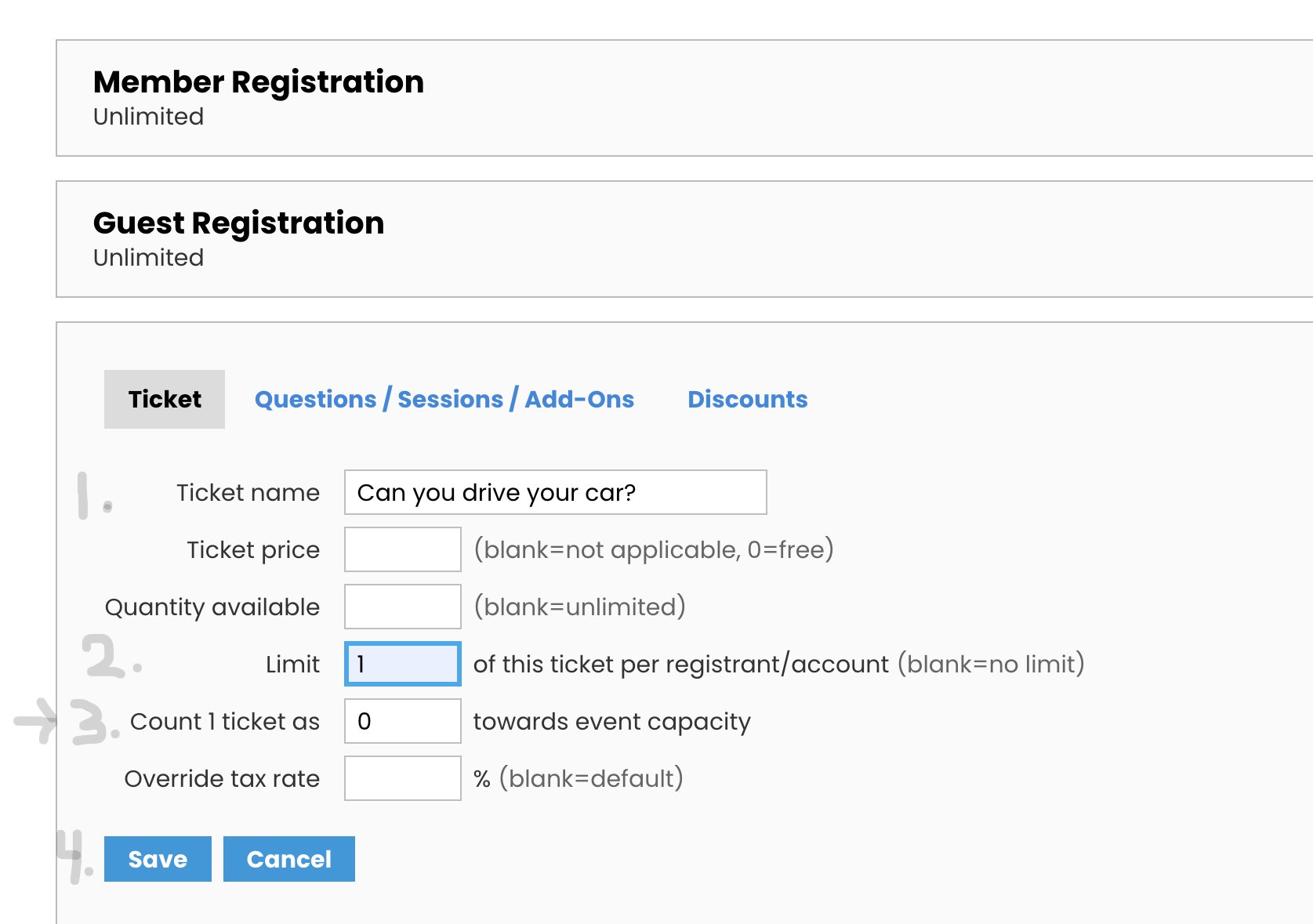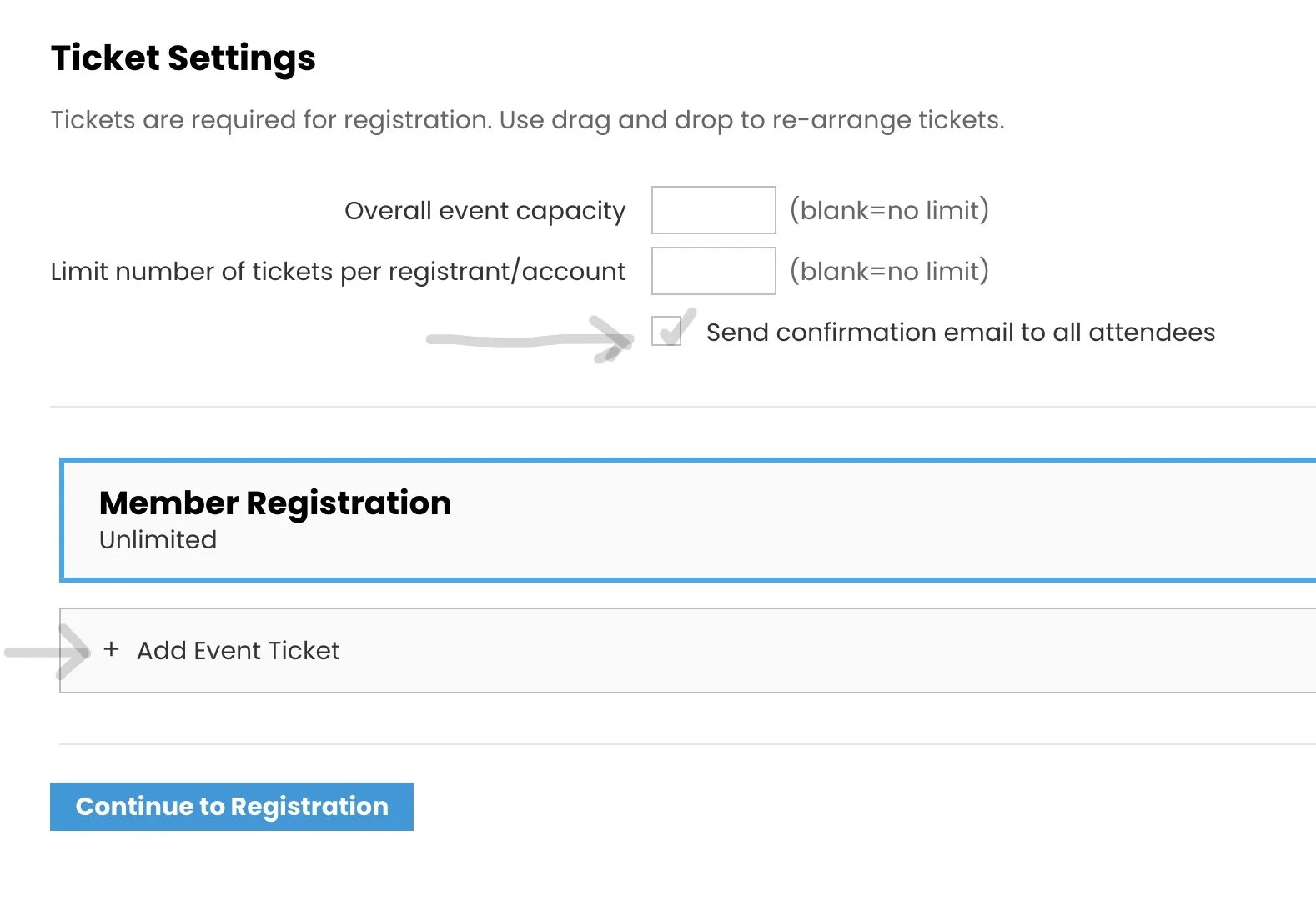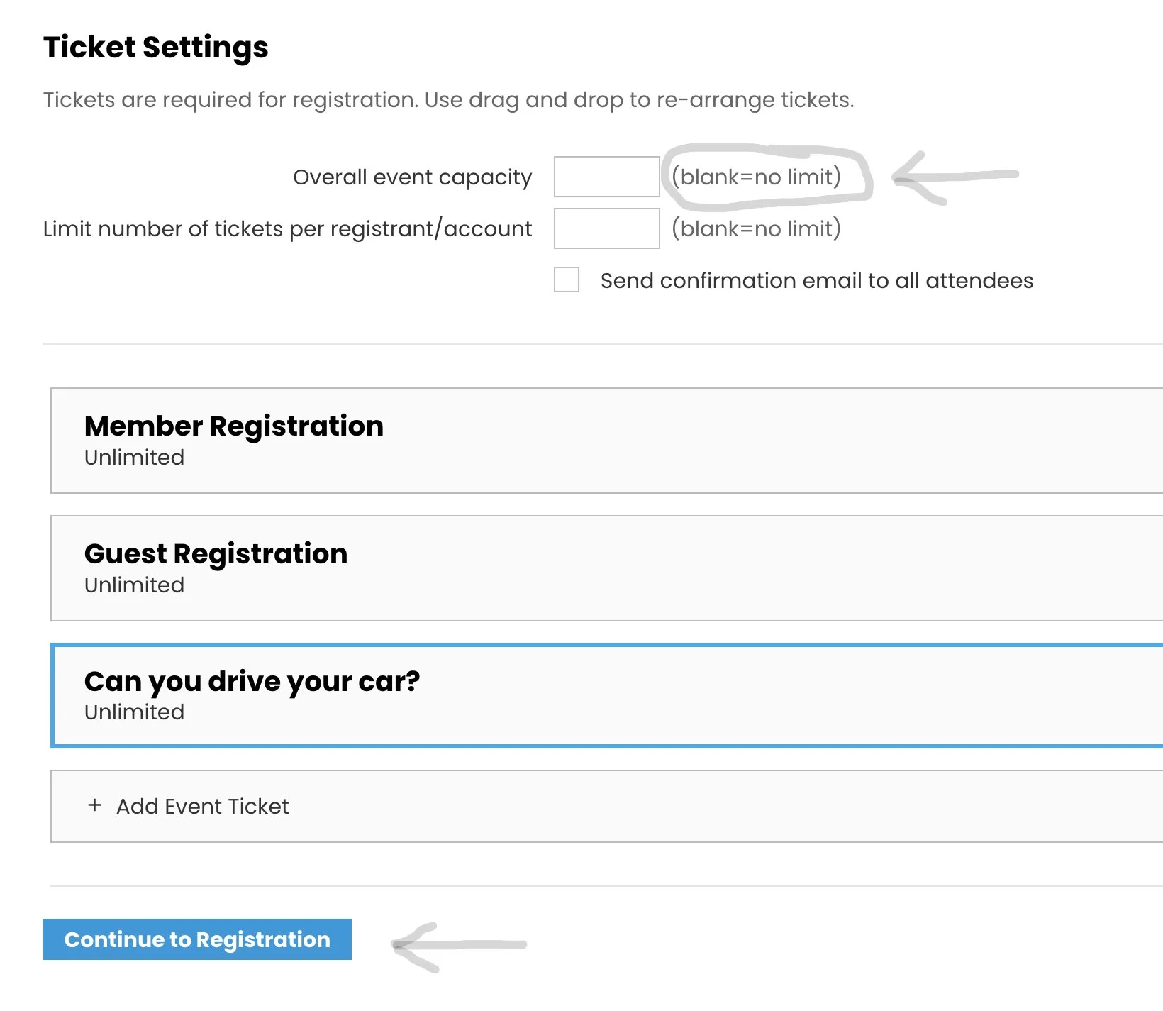 After you click “Save” above, you will be brought back to the Ticket Settings screen. If you want Members & Guests, and you need people to drive cars, your screen should look like this screen on the right. If it does not, you need to go back and see what steps you missed and try again. When your Tickets are what you want, click “Continue to Registration” and follow the steps below.