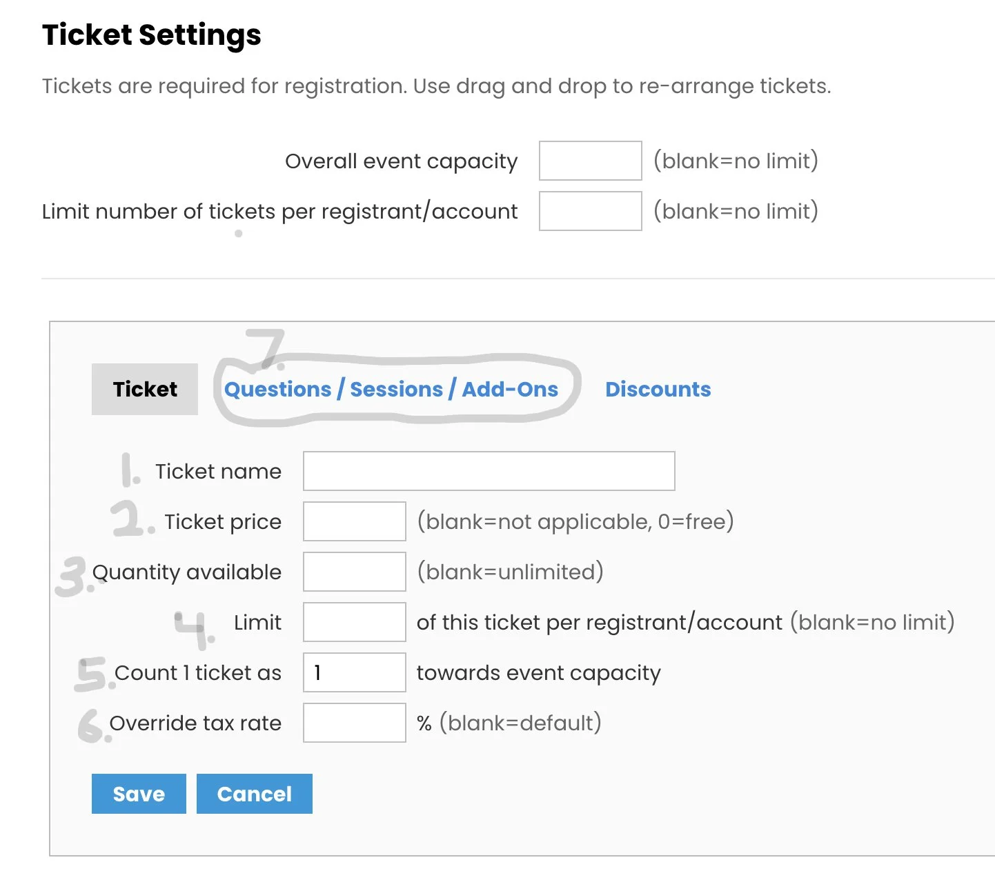 7) Click “Questions/Sessions/Add-Ons in the box above Ticket Name.