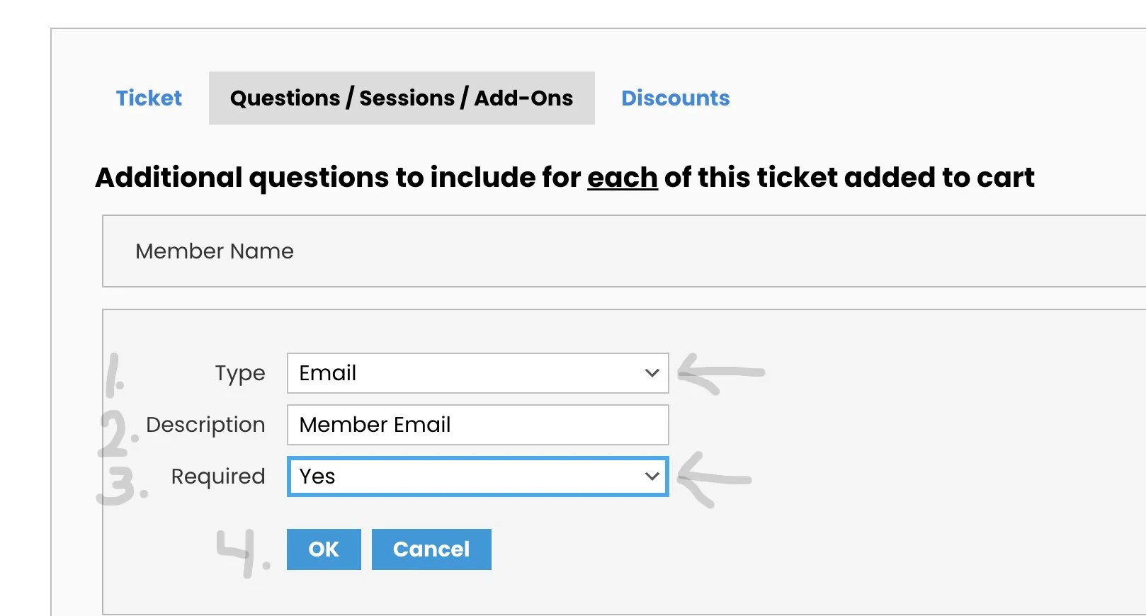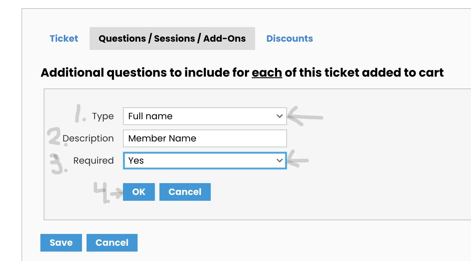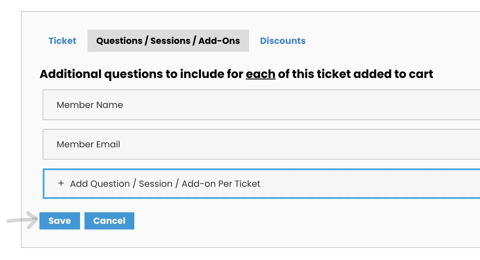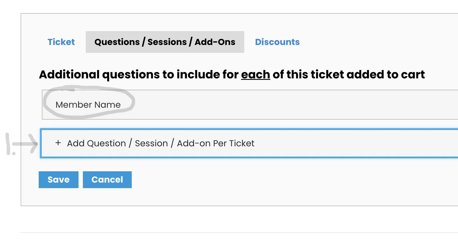 1) Click the box “Add Question/ Session/ Add-On per Ticket”