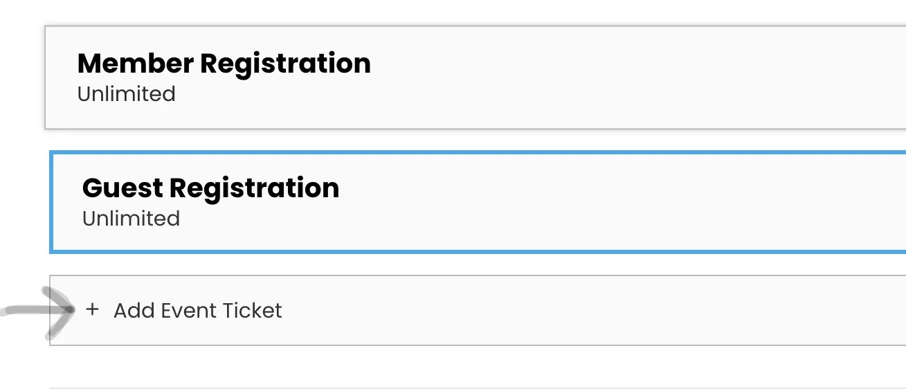 If guests are allowed, click “Add Event Ticket” and follow the above steps to make a “Guest Registration” ticket. Where it says “Member”, change that to Guest in the Ticket Name and in the Full Name box.