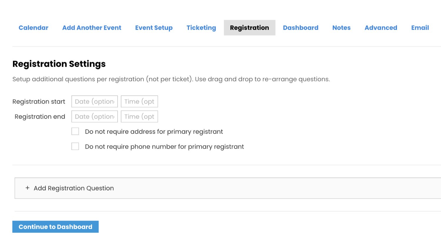 This is where you set the date/time that members can start registering for your event. It is also the place where you set the date/time when they must stop registering.