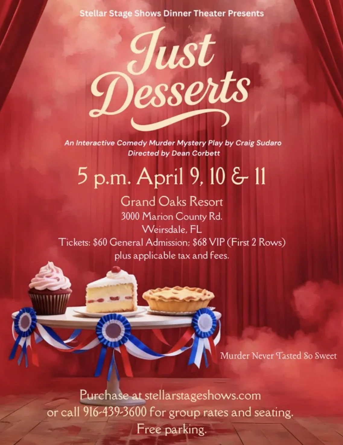 Just Desserts Murder Mystery Playat Grand Oaks ResortDinner IncludedApril 11, 2026Register on our Events Calendar